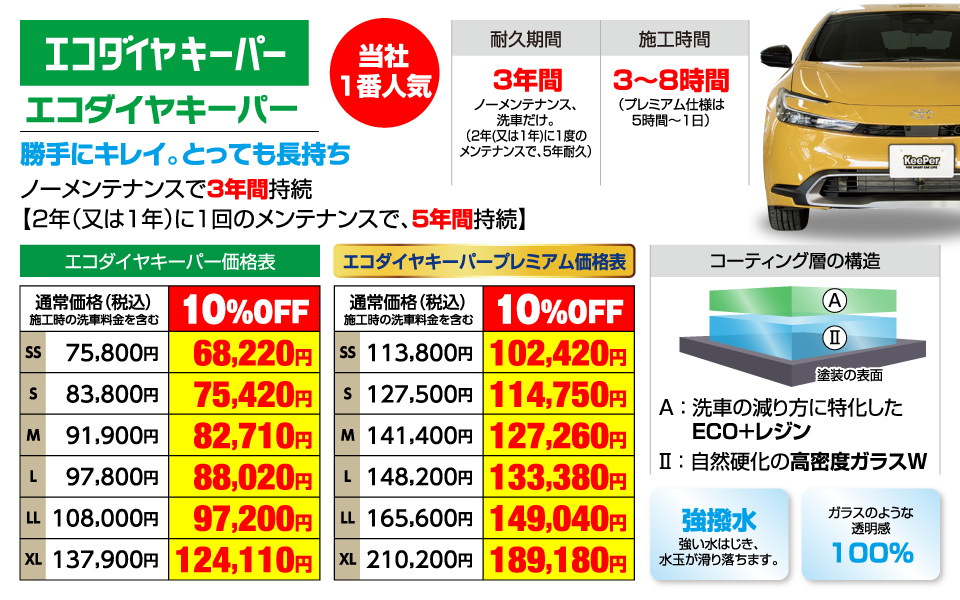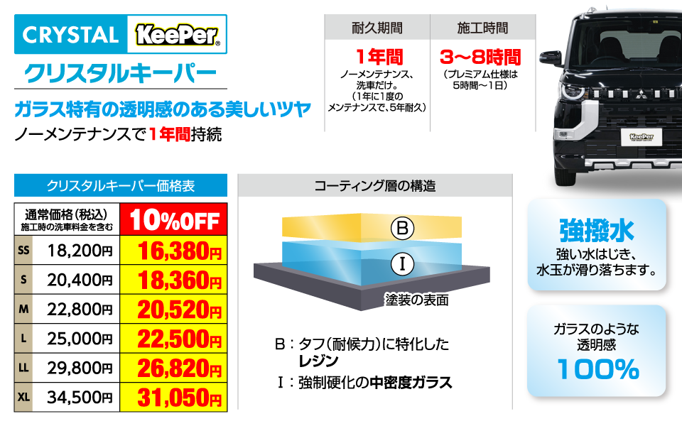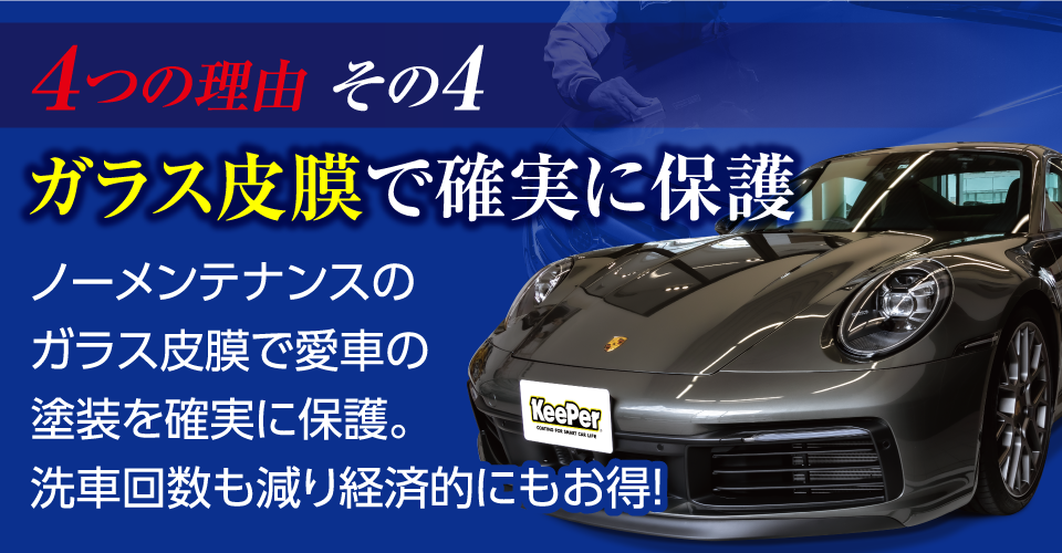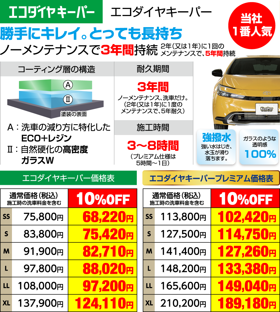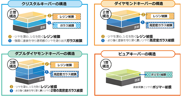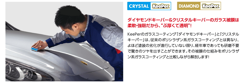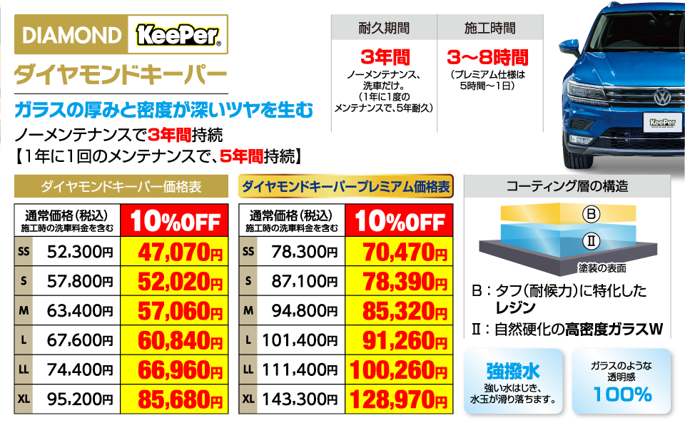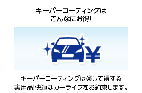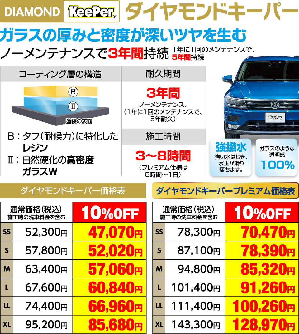 ピュアキーパーなら3ヶ月、クリスタルキーパーなら1年、ダイヤモンドキーパーまたはダブルダイヤキーパーなら3年、ノーWAX、ノーメンテナンスで、塗装をしっかり守り、本当のキレイさを維持することができます。あとは洗車だけで手間いらずの楽ちんなカーライフを実現!