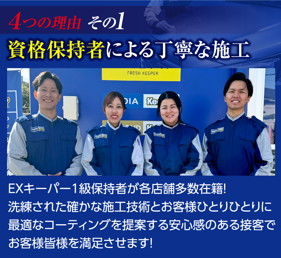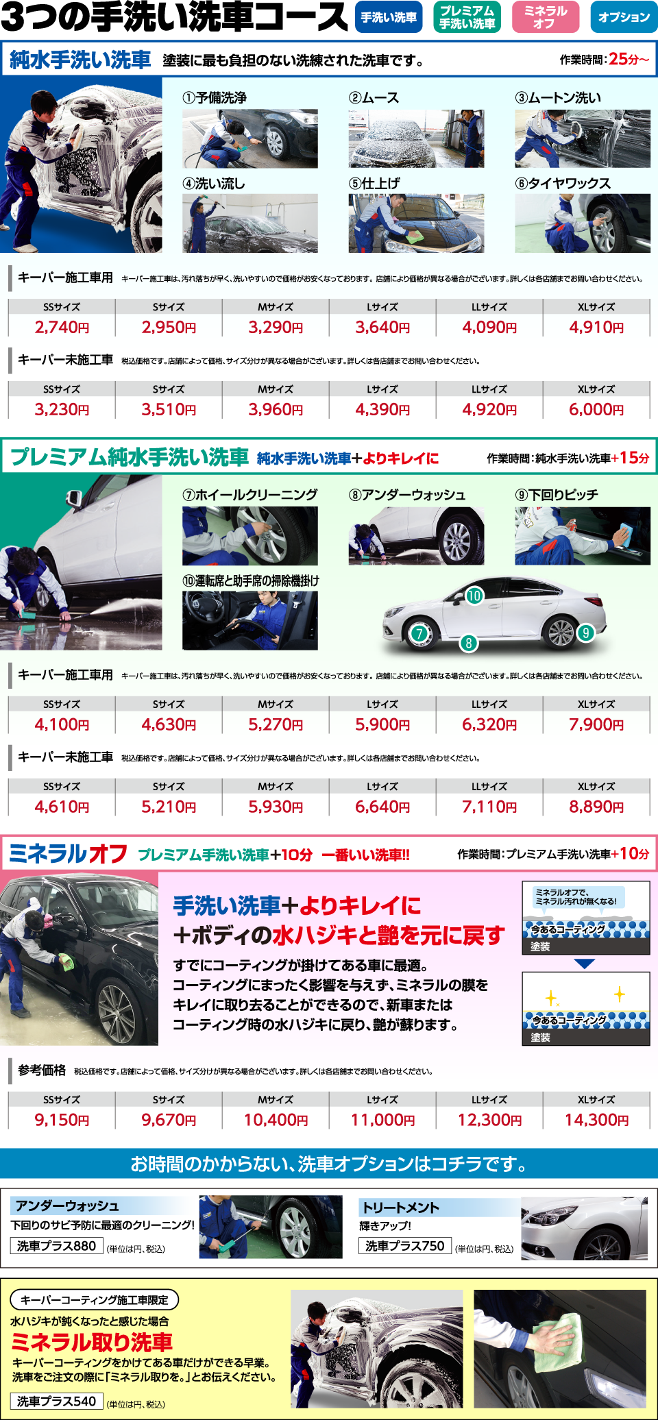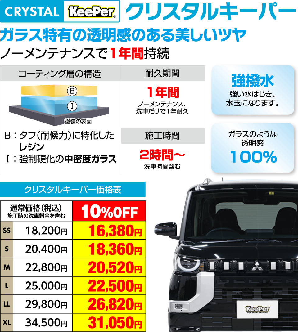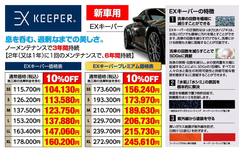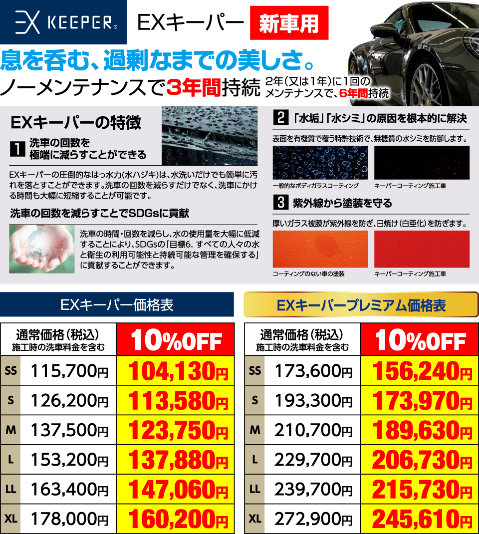 ピュアキーパーなら3ヶ月、クリスタルキーパーなら1年、ダイヤモンドキーパーまたはダブルダイヤキーパーなら3年、ノーWAX、ノーメンテナンスで、塗装をしっかり守り、本当のキレイさを維持することができます。あとは洗車だけで手間いらずの楽ちんなカーライフを実現!